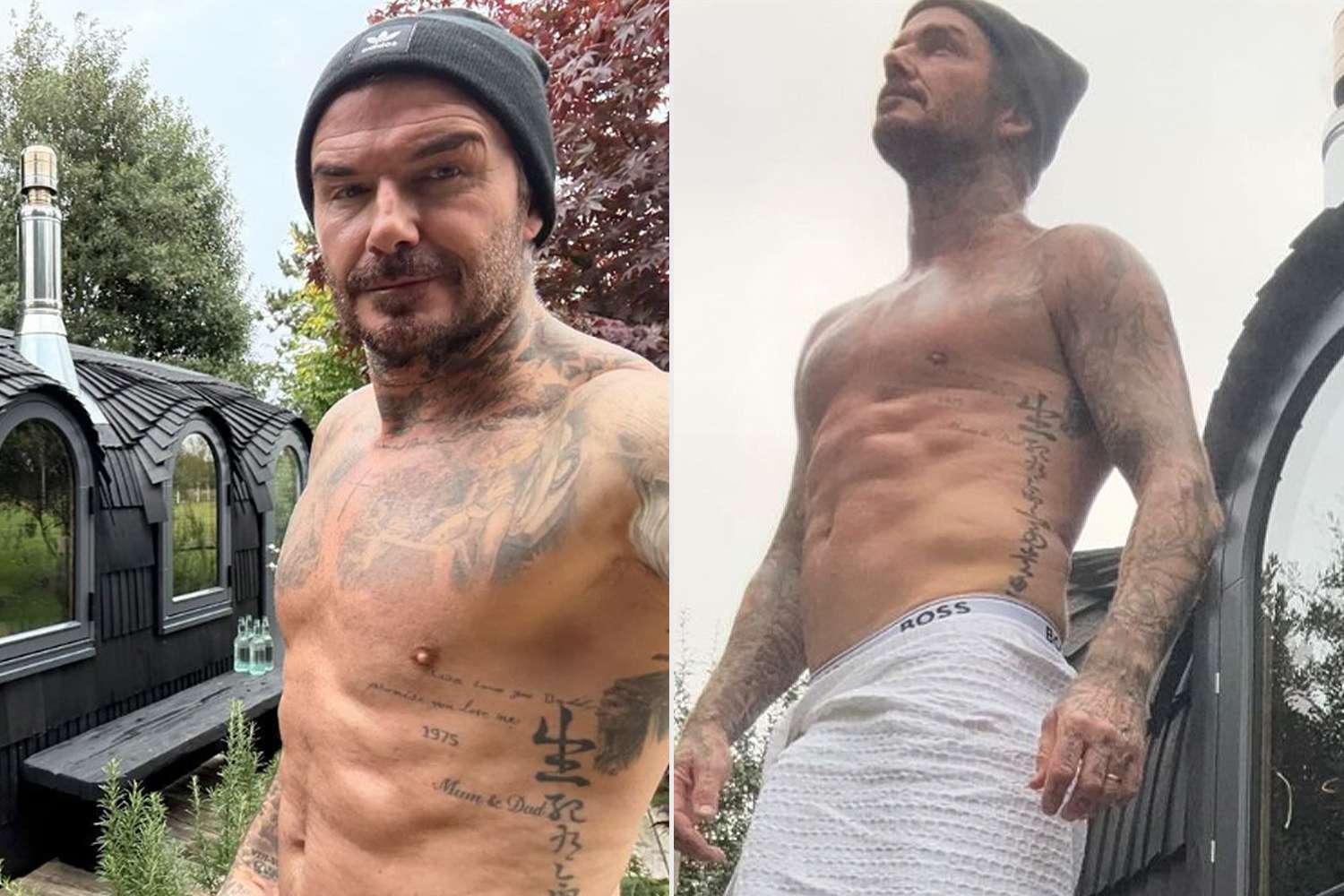 Beckham then uploaded his first shirtless snap, as he wore a beanie and held his phone camera while posing in front of the sauna. “Self-care Sunday 🔥 & 🧊,” he wrote alongside the photo.