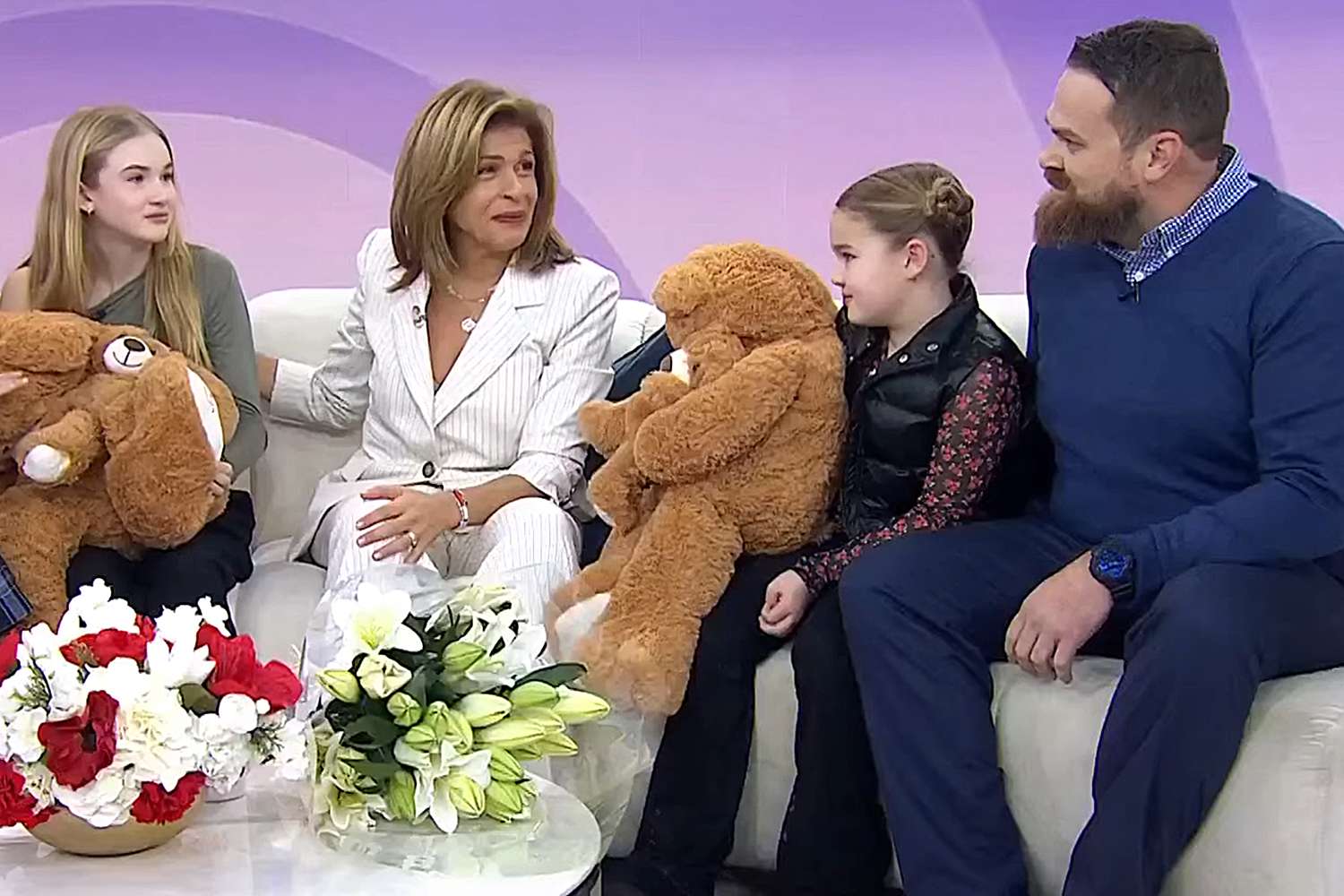 The family came bearing gifts. Jason delivered his late wife’s favorite flowers to Kotb, and the girls brought similar stuffed animal bears for Hoda’s daughters, Hope, 5, and Haley, 7.