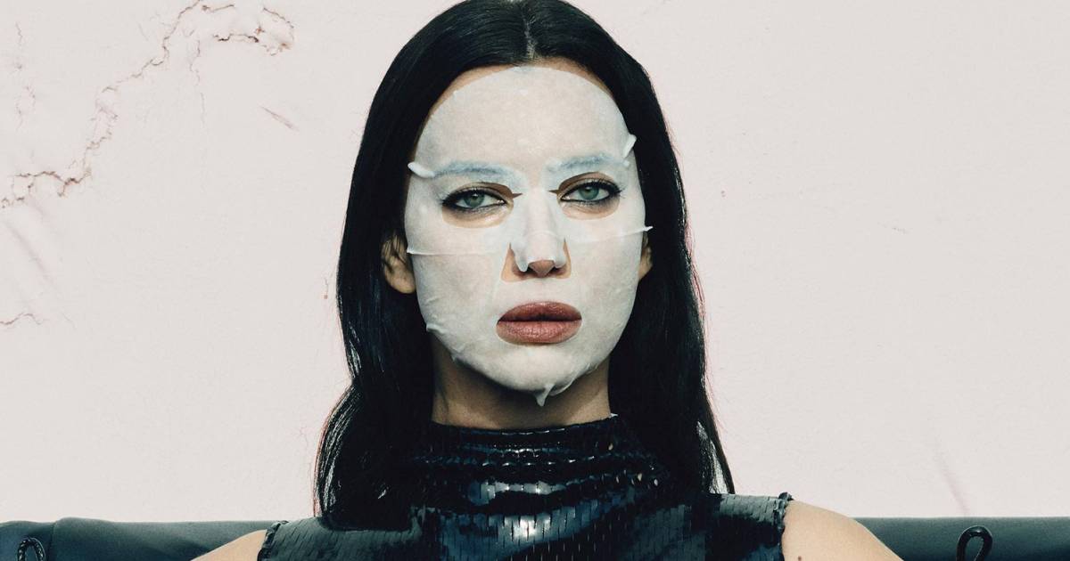 The model, 40, graces the cover of this month’s issue, donning an Alaïa perforated vinyl ruffled top and fluted skirt paired with lace-up C.Ford leather gloves and a white truffle nourishing treatment mask from d’Alba Global Co Ltd.
