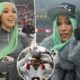 She paired the show-stopping top with loose jeans and a belt, and wore a long black floor-length coat with a brown fur collar over the ensemble.