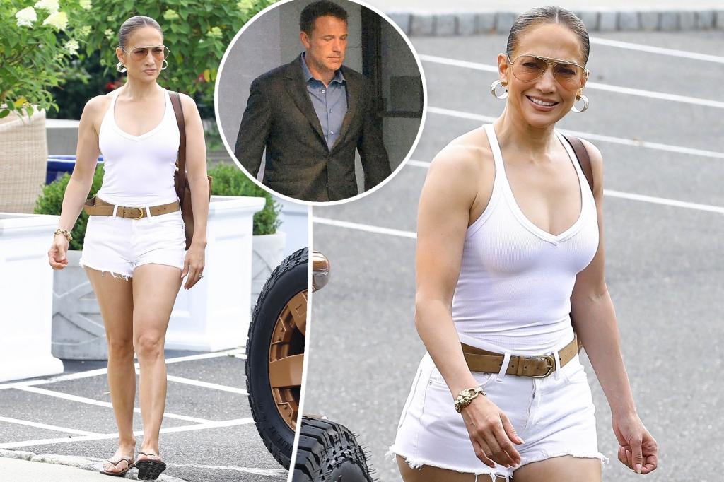 Jennifer Lopez rocked an all-white look as she headed out in the Hamptons with her longtime manager, Benny Medina, on Wednesday — while husband Ben Affleck stayed at home in Los Angeles amid their recent marital woes.