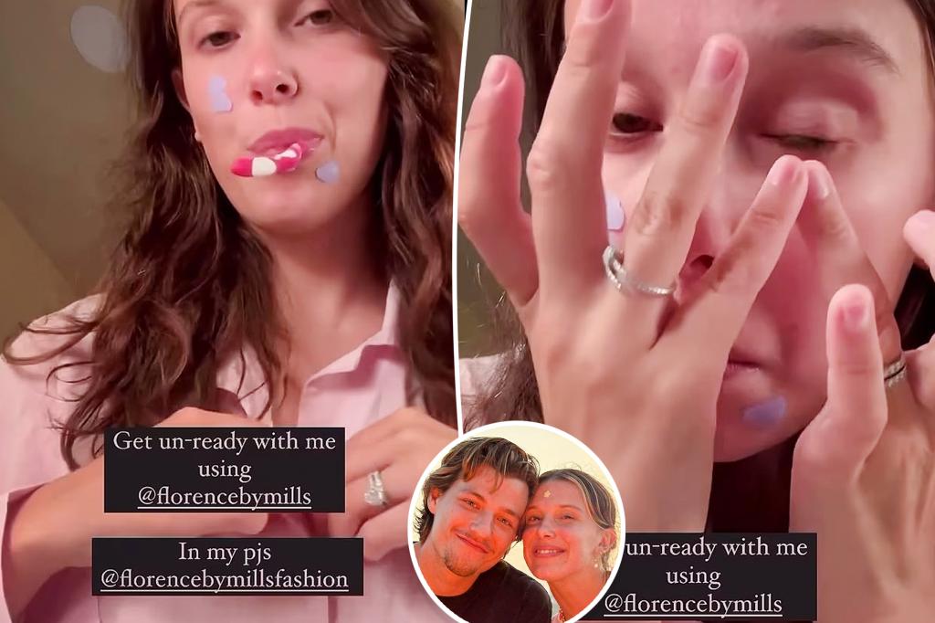 As the “Stranger Things” star brushed her teeth, took out her contacts, and applied purple pimple patches from her own brand, she flashed the diamond design, which matched her equally blinged-out engagement ring.
