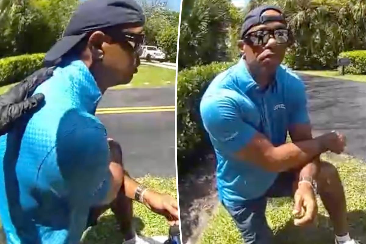 The surprising footage shows the golf great, 50, in sunglasses and a backwards hat while kneeling down in the grass as he’s questioned by police.