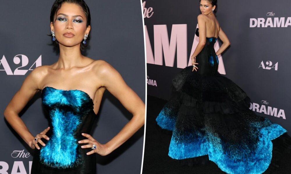 And the bride wore something blue. Zendaya arrived at the New York City premiere of “The Drama” on Thursday night in a strapless black and blue...
